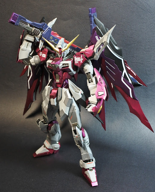 Recently I am trying to use metallic purple and metallic red as main color. Basically it's black primer->Gaia EX-07-> clear color. Modo MX-03 and Gaia EX-07 on frame and weapon. And using Gaia 008 as finishing coat. Although it's named flat clear, actually it's more likely to semi-gloss. I think it looks good with metallic painting.